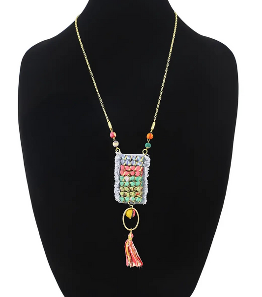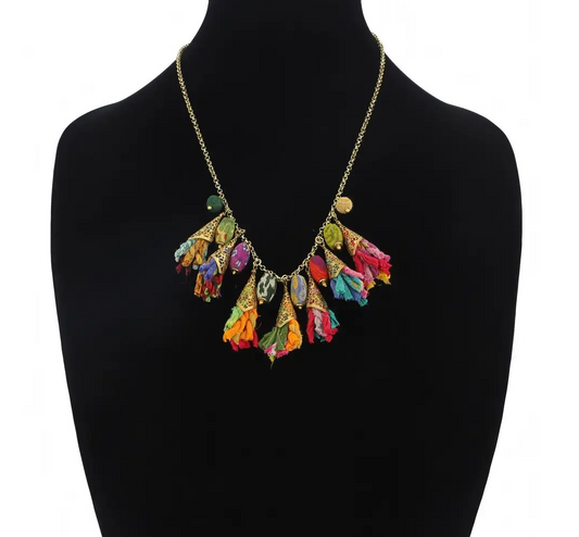 Handmade Cotton & Brass Multi-tassel Necklace with Bead Accents