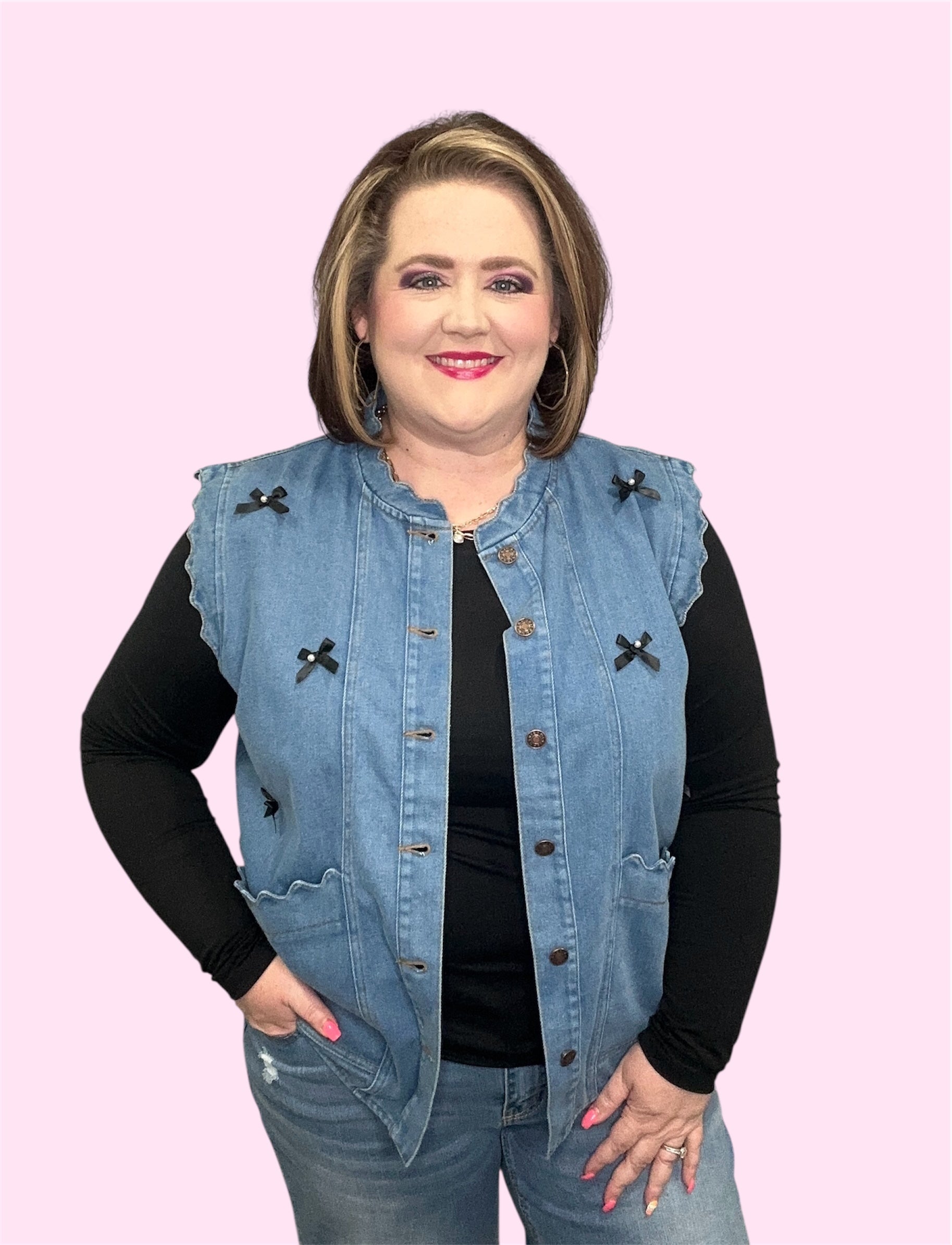 Step up your layering game with this adorable acid washed denim vest, designed with feminine charm and a touch of edge. Featuring a sleeveless cut and button-front closure, this vest is perfect for pairing over your favorite blouses, tees, or dresses. The delicate black bow and pearl accents add a sweet, standout detail, while the scalloped pocket stitching gives it a playful twist.