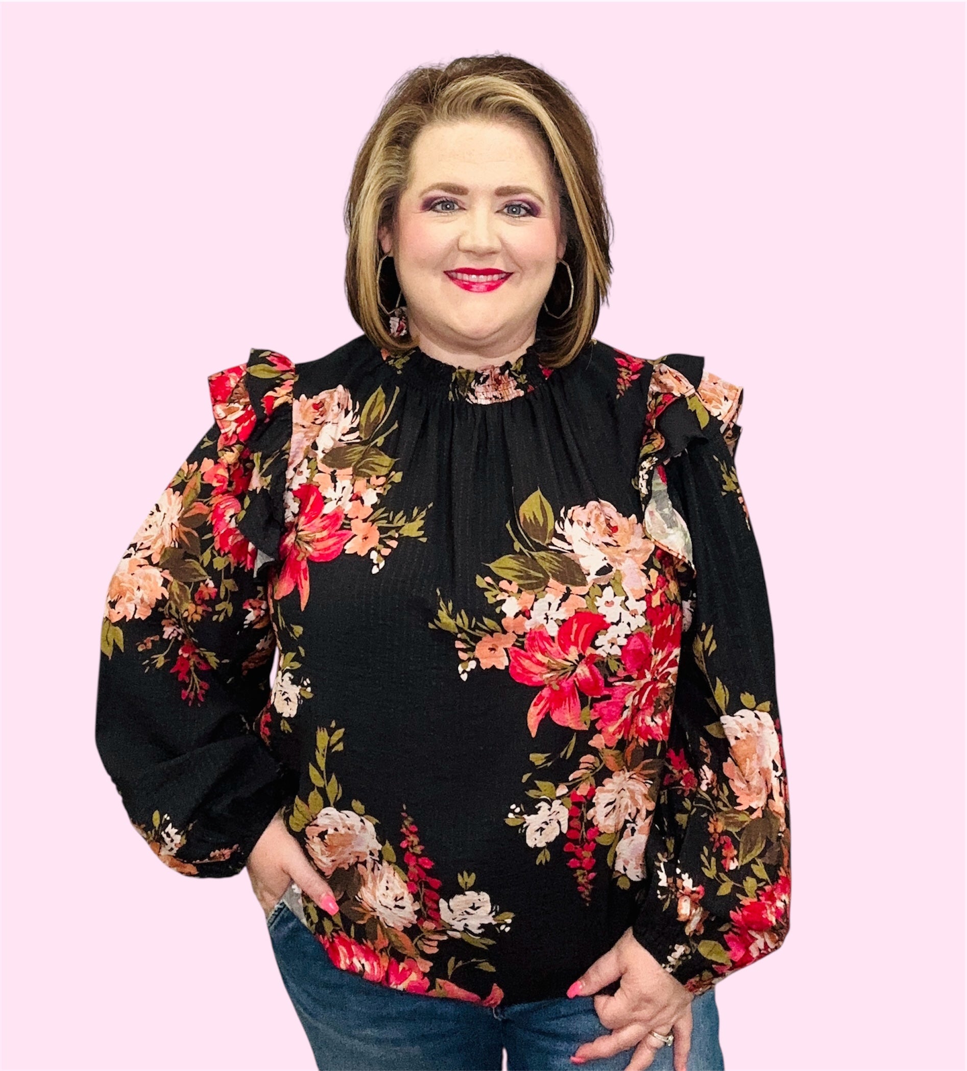 This elegant top is the perfect blend of sophistication and femininity. Featuring a smocked neckline, subtle ruffle accents, and flowy long sleeves, it’s designed to flatter while keeping you comfortable. The black base with vibrant floral print makes it an easy standout piece for any wardrobe.