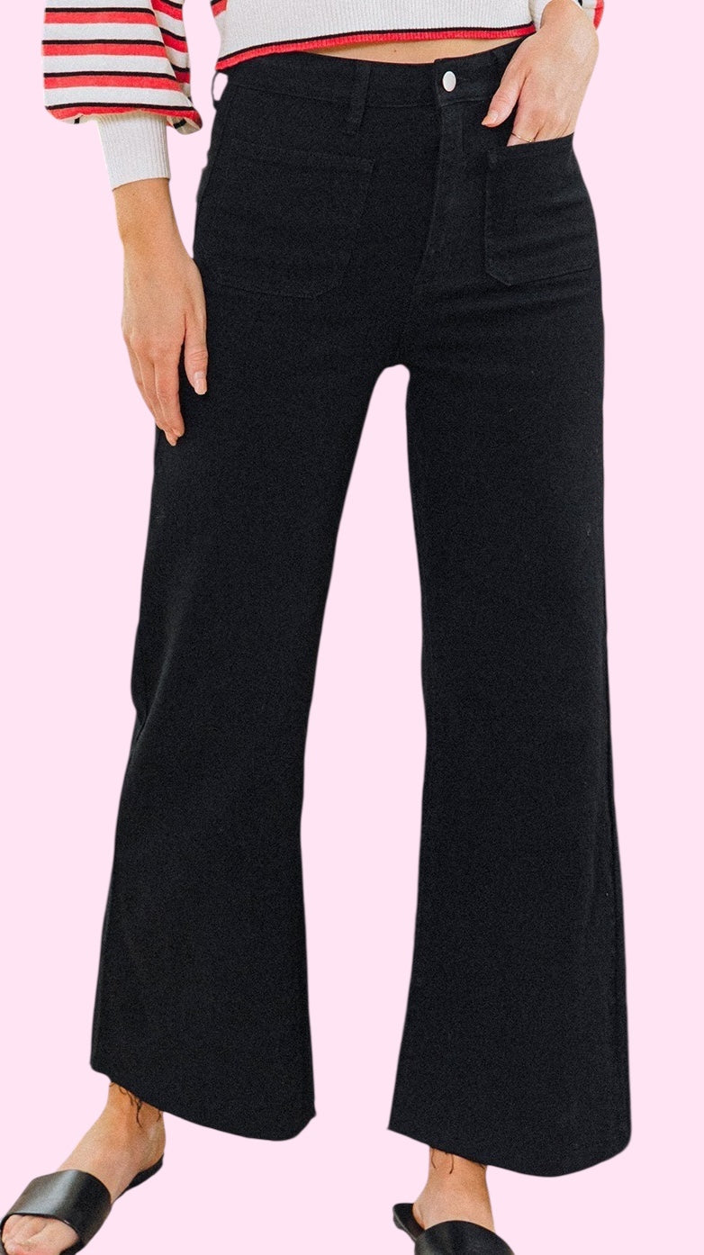 Elevate your everyday wardrobe with these sleek black wide-leg pants. Designed with a flattering high-rise fit, these pants feature a raw hem for a modern, effortless vibe. The structured silhouette combines comfort with style, making them versatile enough for casual outings or dressed-up looks. Pair with your favorite blouse, sweater, or graphic tee for endless outfit options.