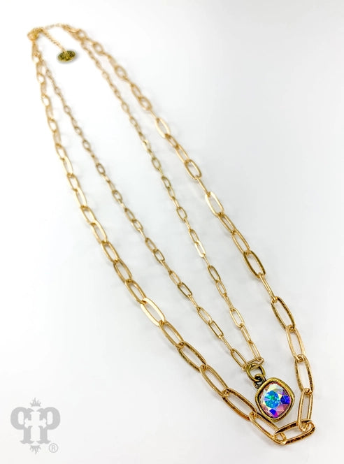 This double paperclip chain necklace features an 8mm Austrian crystal cushion cut drop. Approximately 16 inches with extender chain