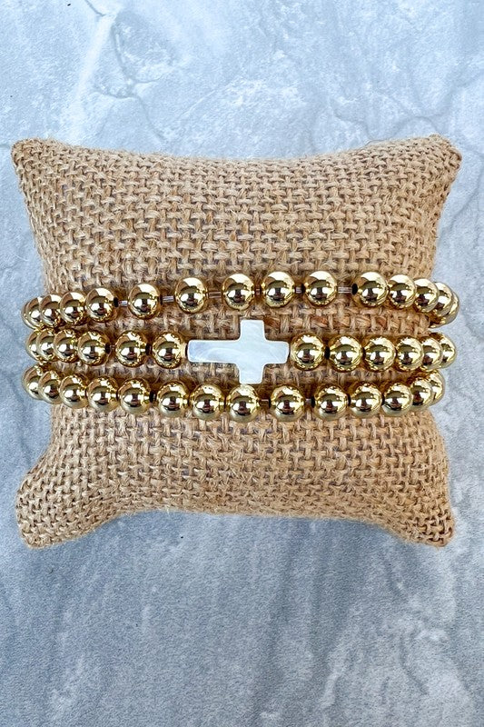 Get ready to elevate your wrist game with the Dylan 70367! This set of 3 gold beaded stretchy bracelets includes one with a small white marble cross, adding a subtle touch of elegance to your look. Perfect for everyday wear or special occasions, these bracelets are a must-have for any stylish individual.