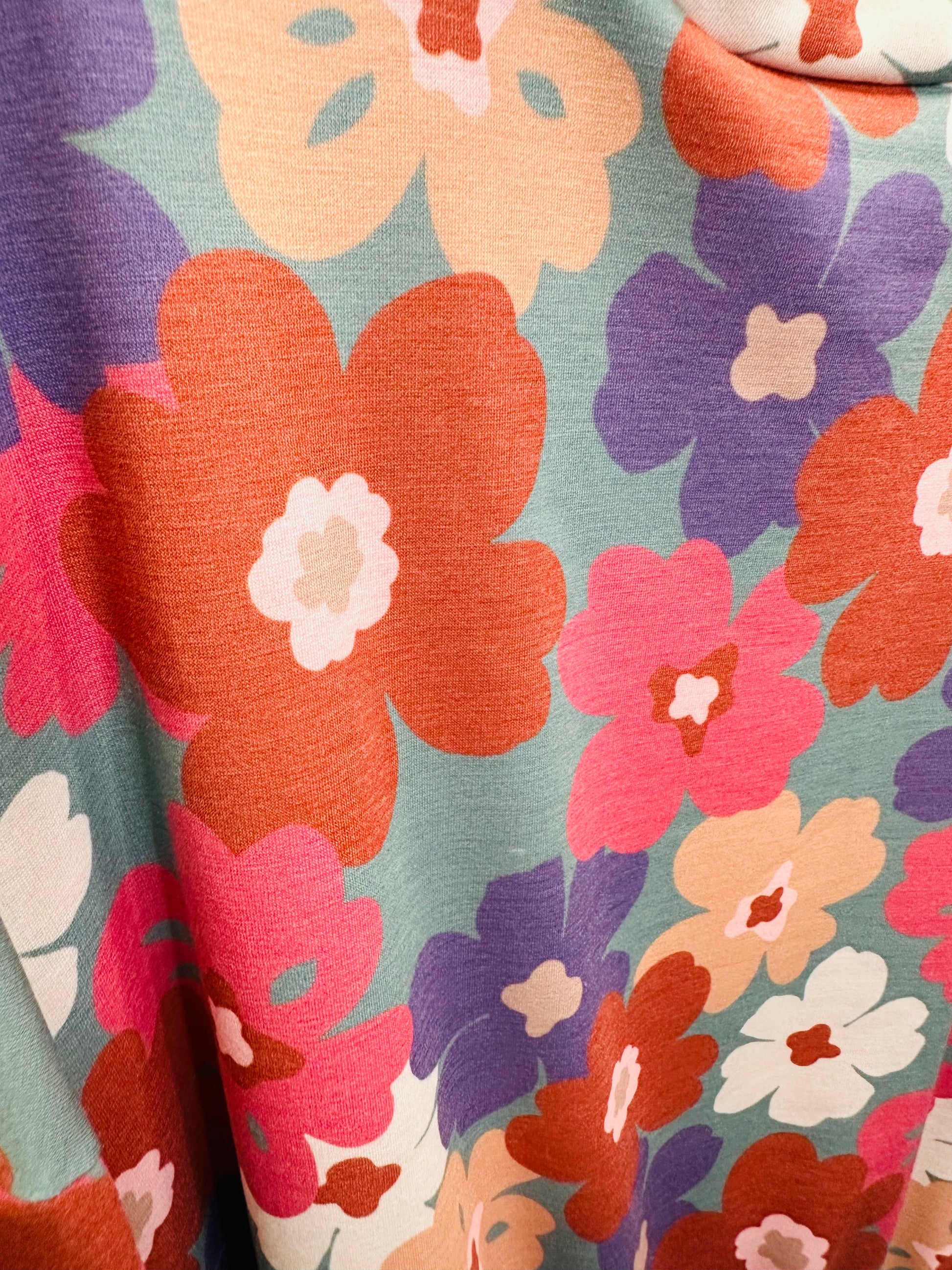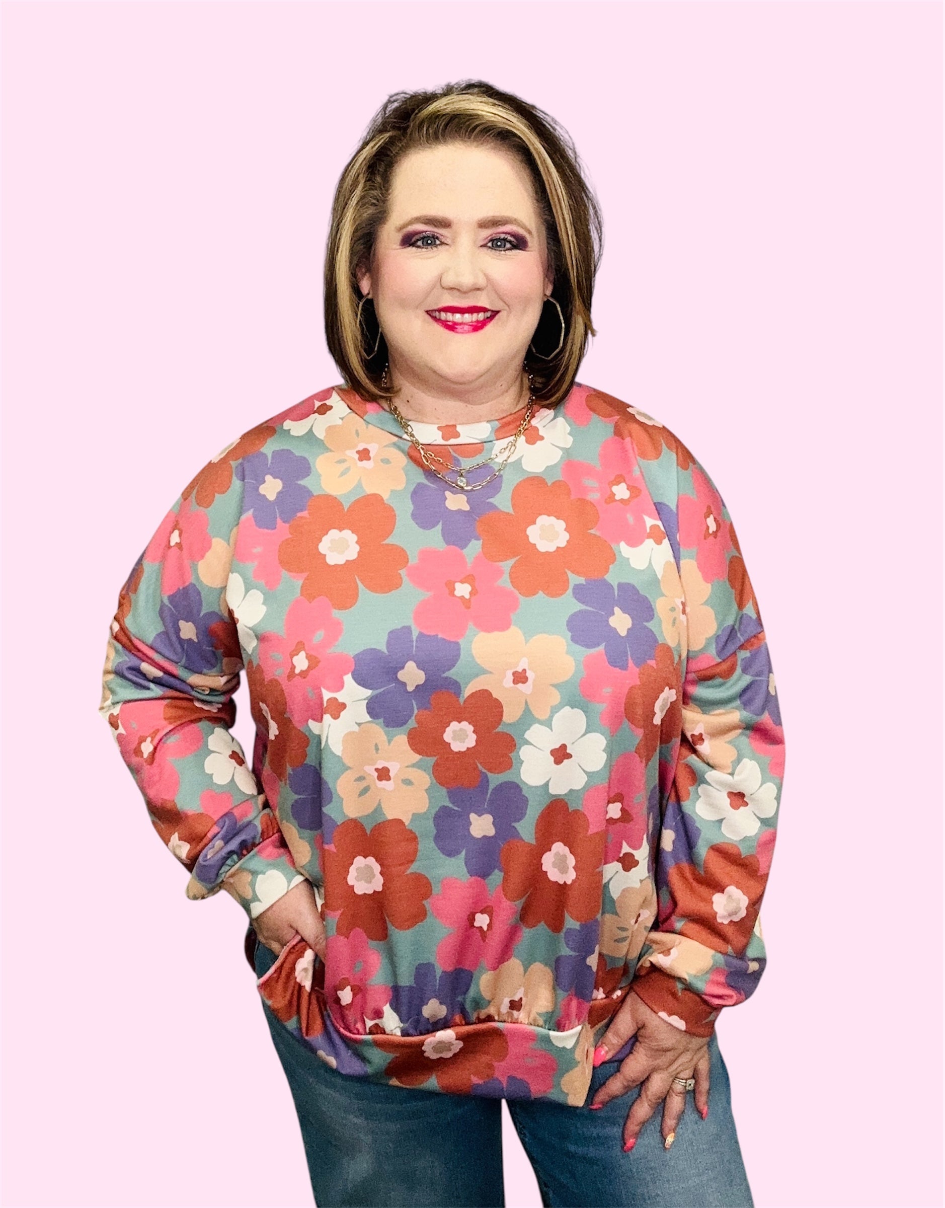 Brighten up your wardrobe with this playful Floral Bliss Long Sleeve Top, featuring a bold retro-inspired floral print in shades of coral, pink, purple, and cream. Designed with a relaxed fit, lightweight stretch fabric, and ribbed trim, this top is as comfy as it is stylish—perfect for casual days, lounging, or adding a pop of color to your everyday look.