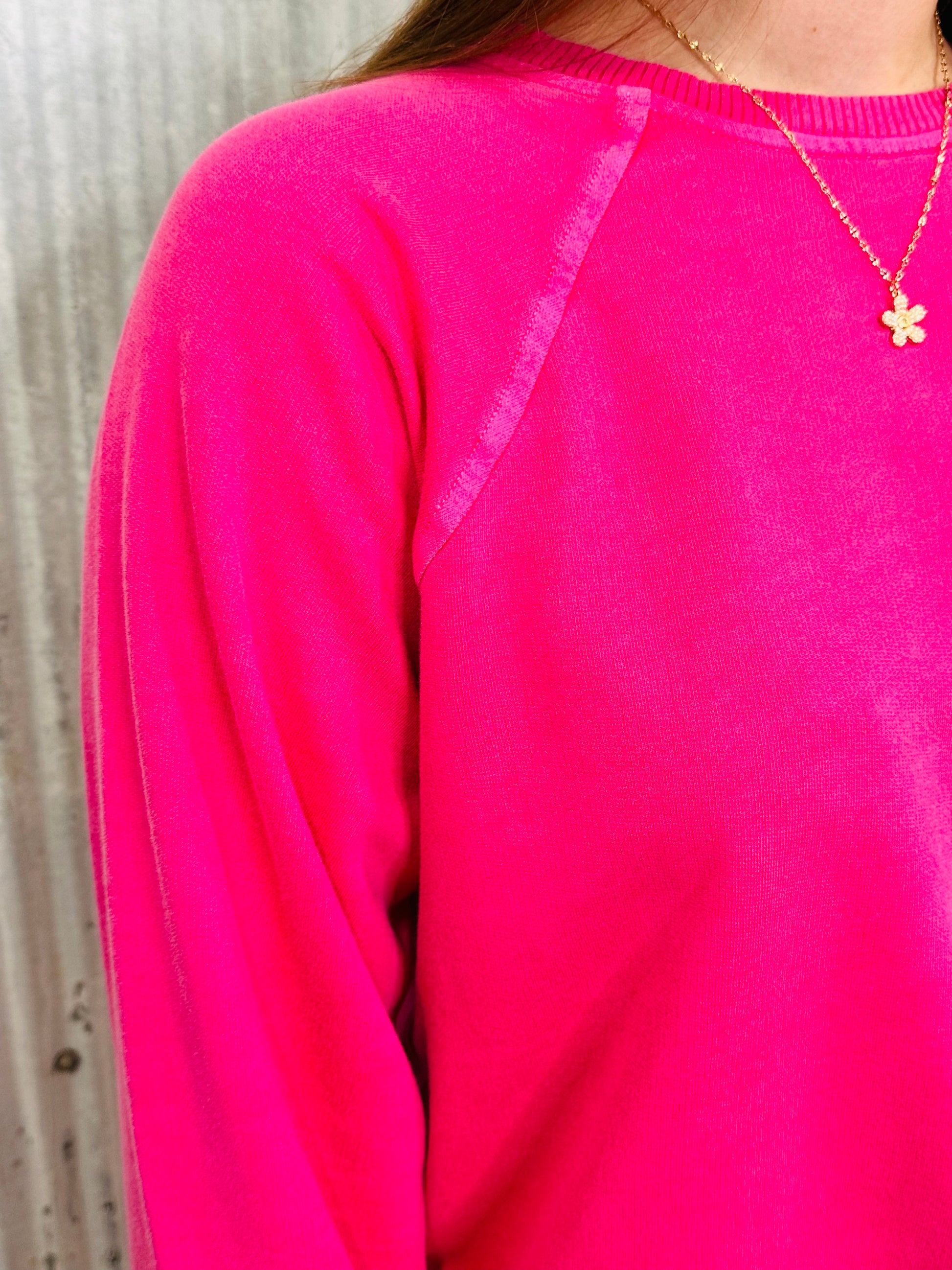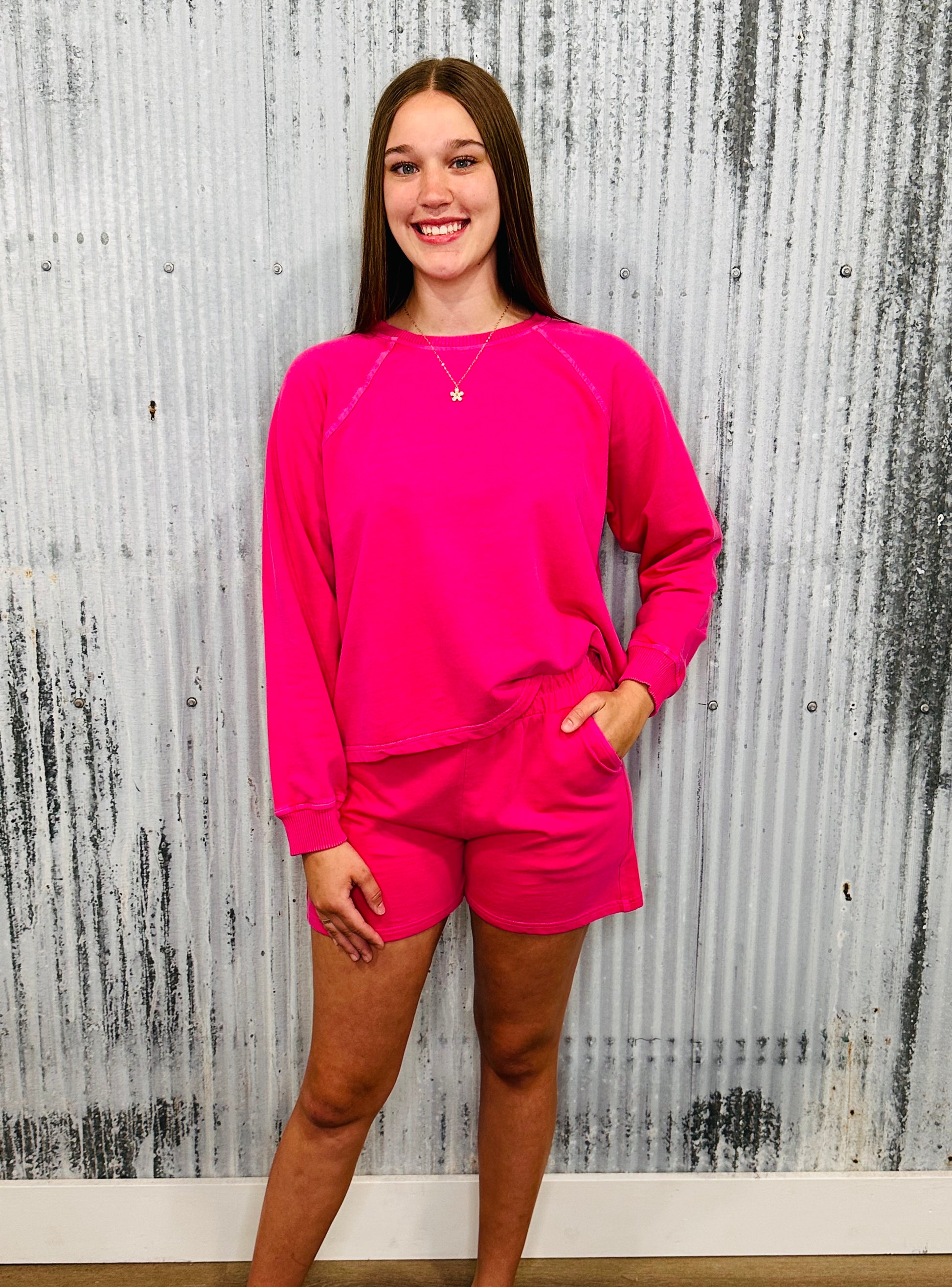 Cozy meets cute in this laid-back French terry lounge set! Made from 100% cotton, it features a relaxed long-sleeve top with raw edge detailing and matching shorts with a comfy elastic waistband and 3.25” inseam. The hot pink hue adds a fresh pop of color you’ll love lounging in—or running errands in style.