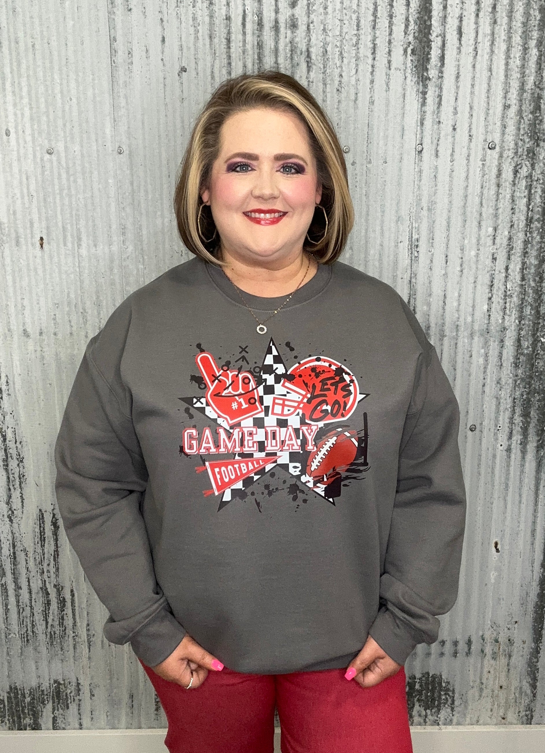 Get ready to cheer loud and proud in our Game Day Graphic Sweatshirt! Featuring bold red, black, and white graphics with football-themed icons like a foam finger, megaphone, and football—all layered over a black-and-white checkered star—this sweatshirt brings the perfect mix of sporty and spirited.