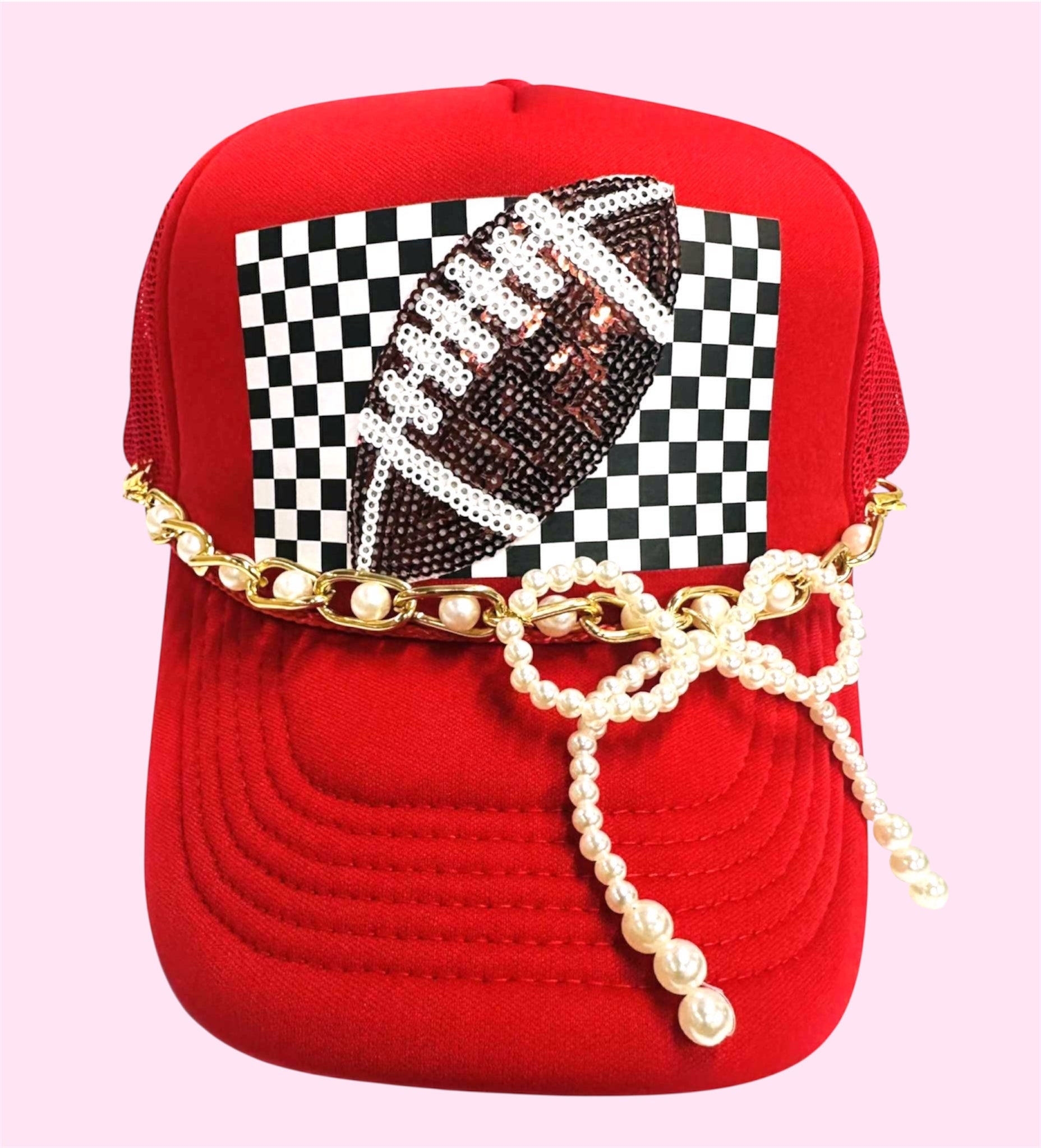 Bring some glam to game day with this standout trucker hat! Featuring a sequin football design on a black-and-white checkered background, this red cap is accented with a chic gold chain and pearl bow detail across the brim. The breathable mesh back keeps you cool, while the adjustable snap closure ensures a comfortable, custom fit. Perfect for cheering on your team in style!