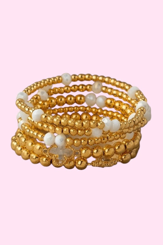 Add instant elegance to your jewelry collection with this stunning gold and white beaded bracelet set. Featuring a mix of gleaming gold beads and chic white accents, this stack is designed to complement everything from casual denim to your favorite dressy look. A subtle cross bead adds a touch of faith-inspired charm, making it both meaningful and stylish.