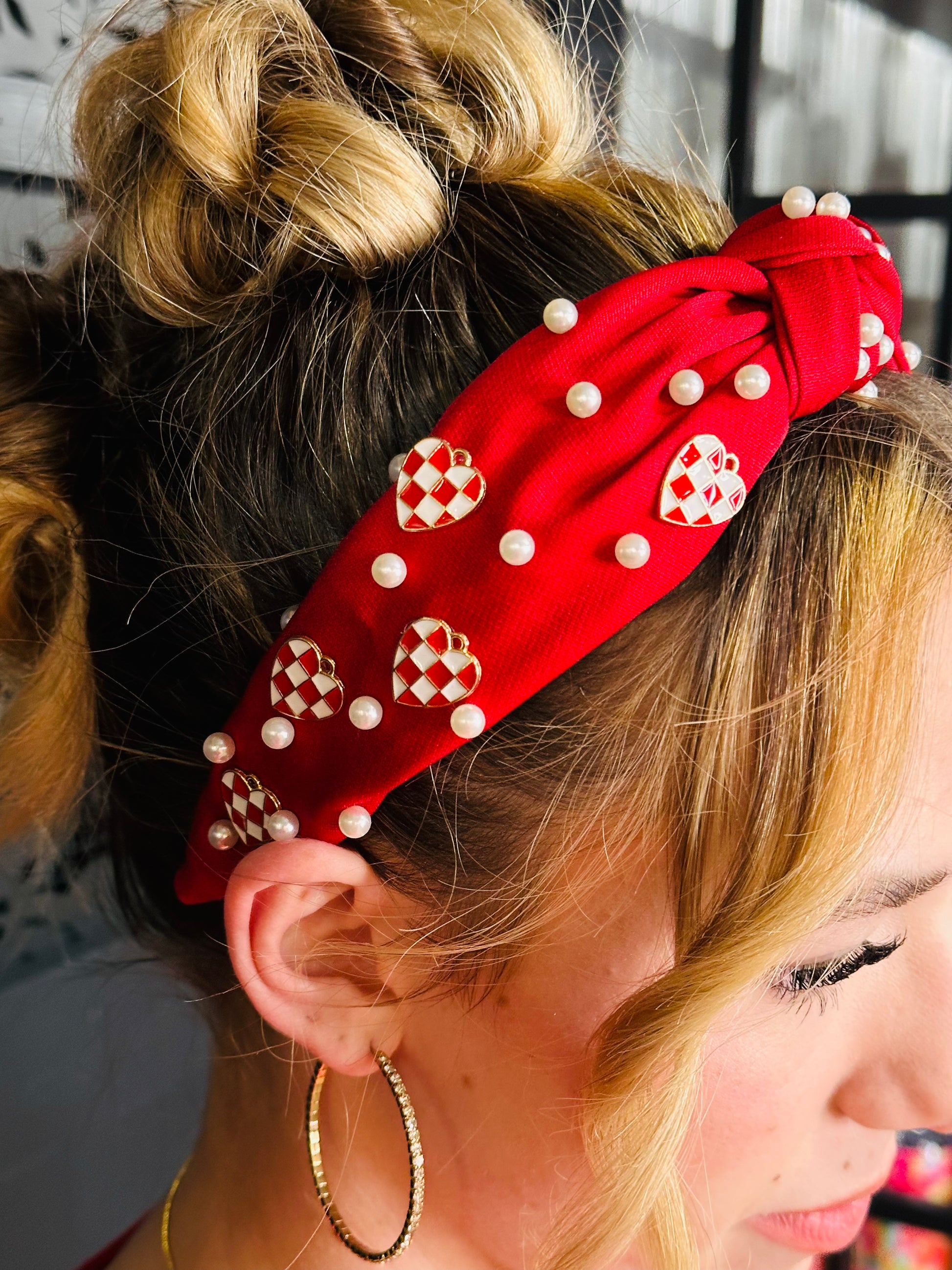 Knotted Pearl/Checker Heart Charm Headband-Red