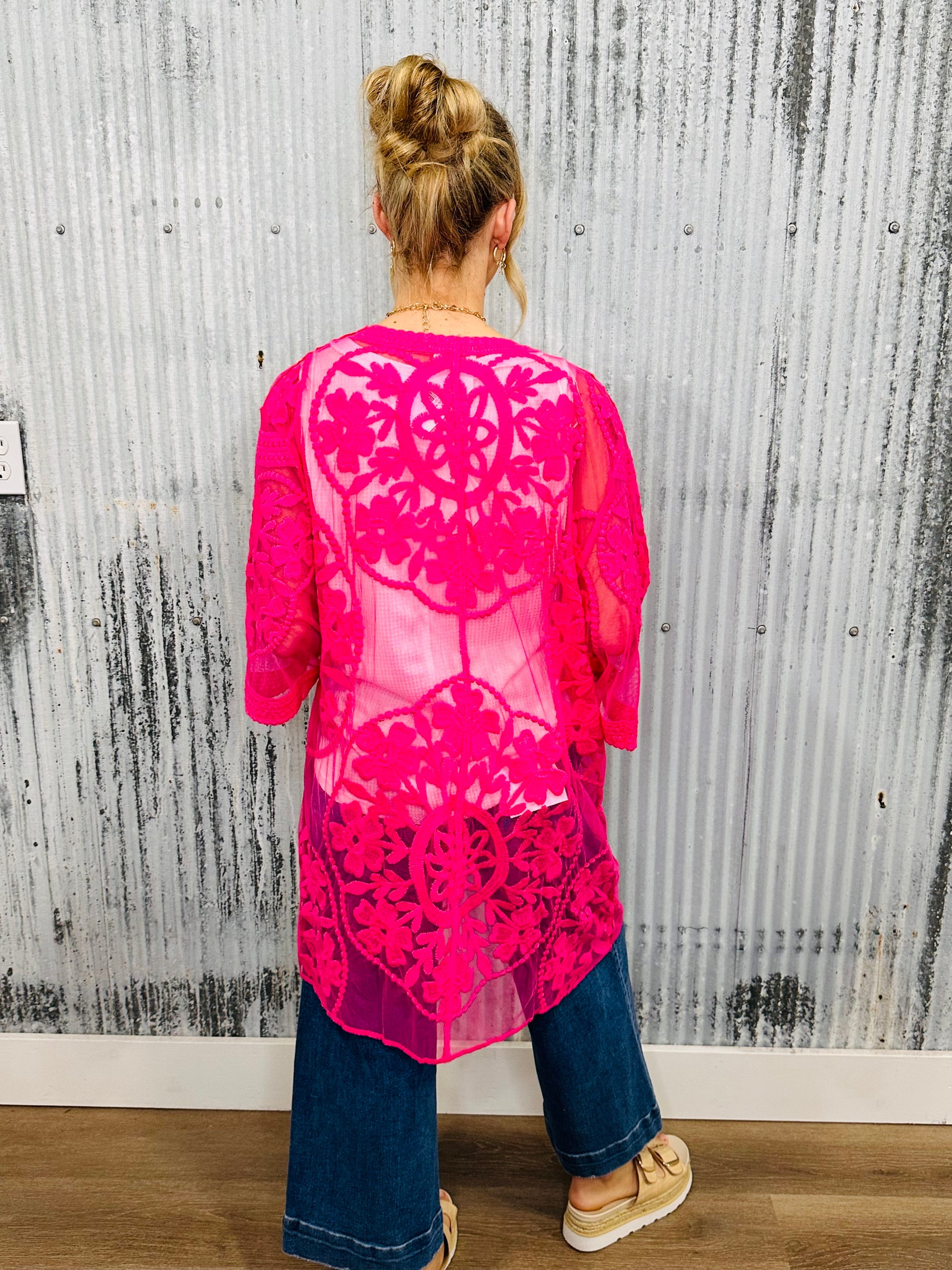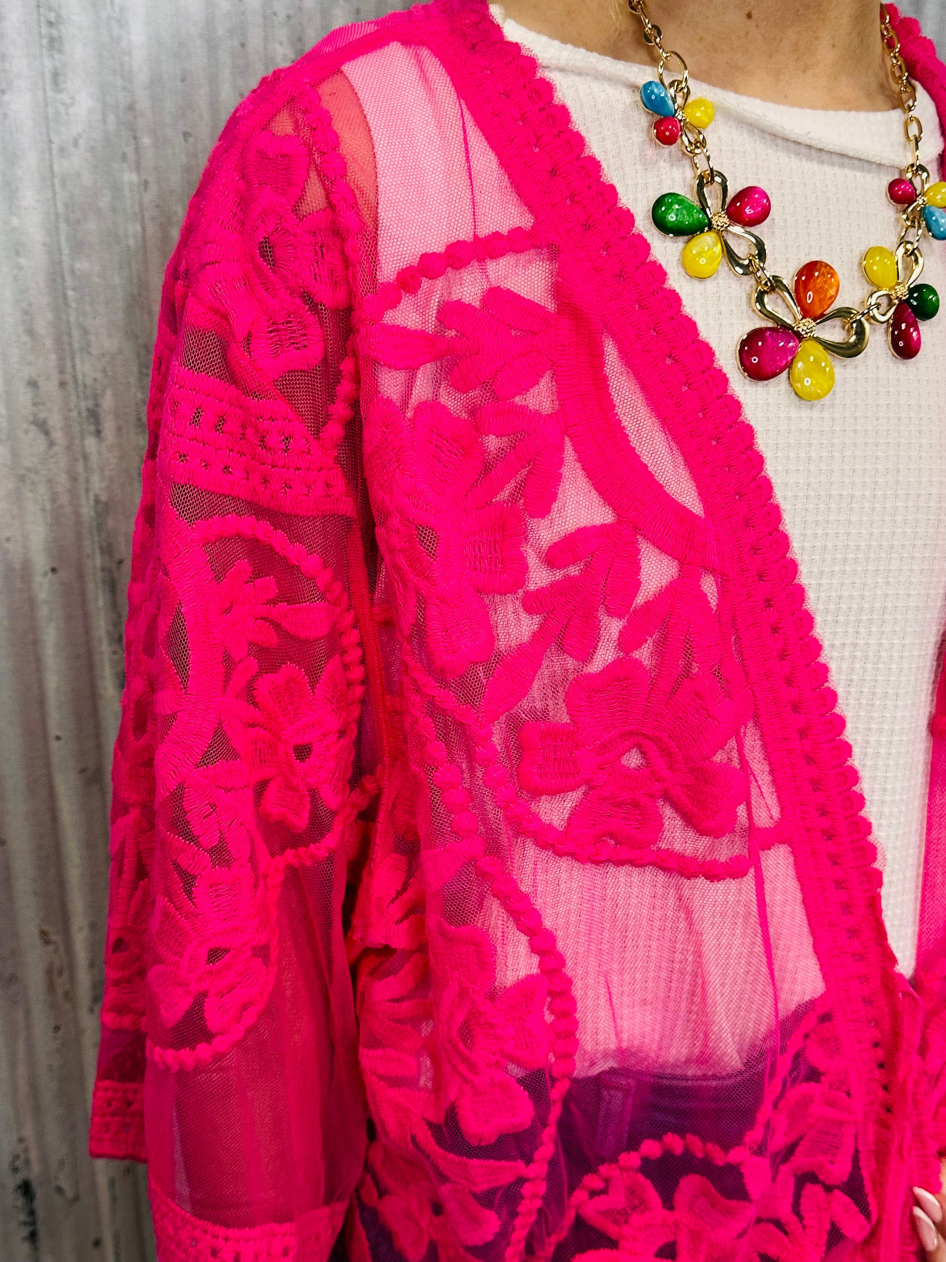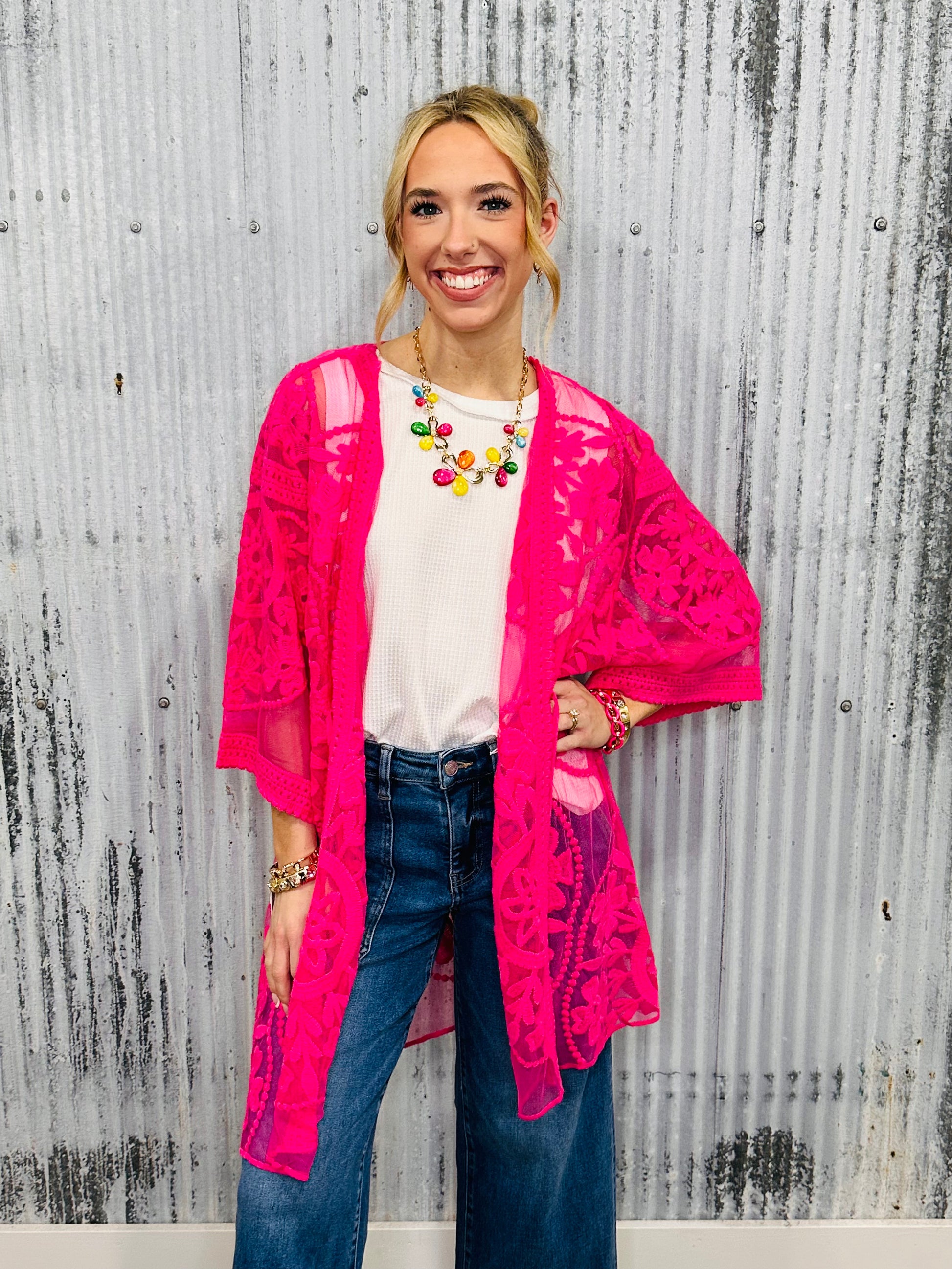 Add a pop of hot pink to your outfit with this Lace Kimono. Perfect for layering, this floral patterned kimono ties at the front for a stylish look. Stay cool and fashionable at the same time!