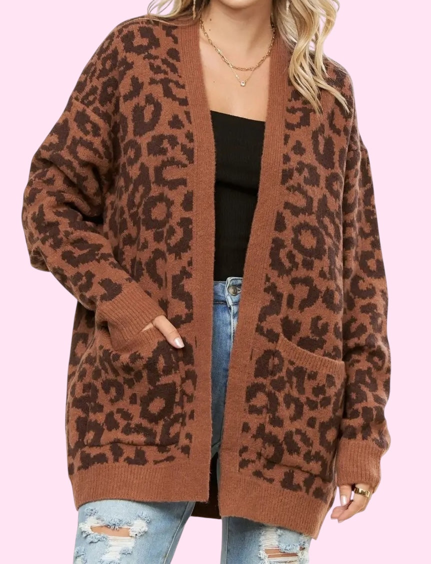 Wrap yourself in cozy-chic style with this Leopard Sweater Cardigan! Featuring a bold leopard print in warm brown tones, this cardigan is the perfect layering piece to take you from casual days to cozy nights. Designed with an open front, roomy patch pockets, and a relaxed oversized fit, itβs as practical as it is stylish. Pair it with jeans and a tee for an effortless everyday look or layer over a dress for added warmth and flair.