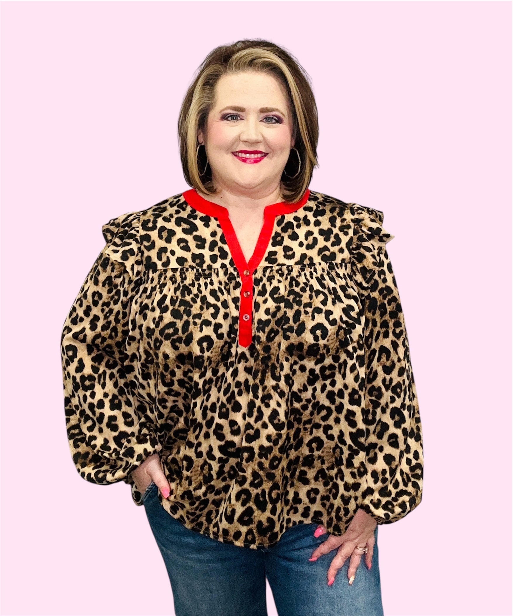 Unleash your wild side with this chic leopard print top! Crafted from 100% polyester, this lightweight blouse features ruffle shoulder detailing, a bold red button placket, and long sleeves with gathered cuffs for a touch of sophistication. The relaxed fit makes it perfect for pairing with your favorite denim or trousers for an effortlessly stylish look.