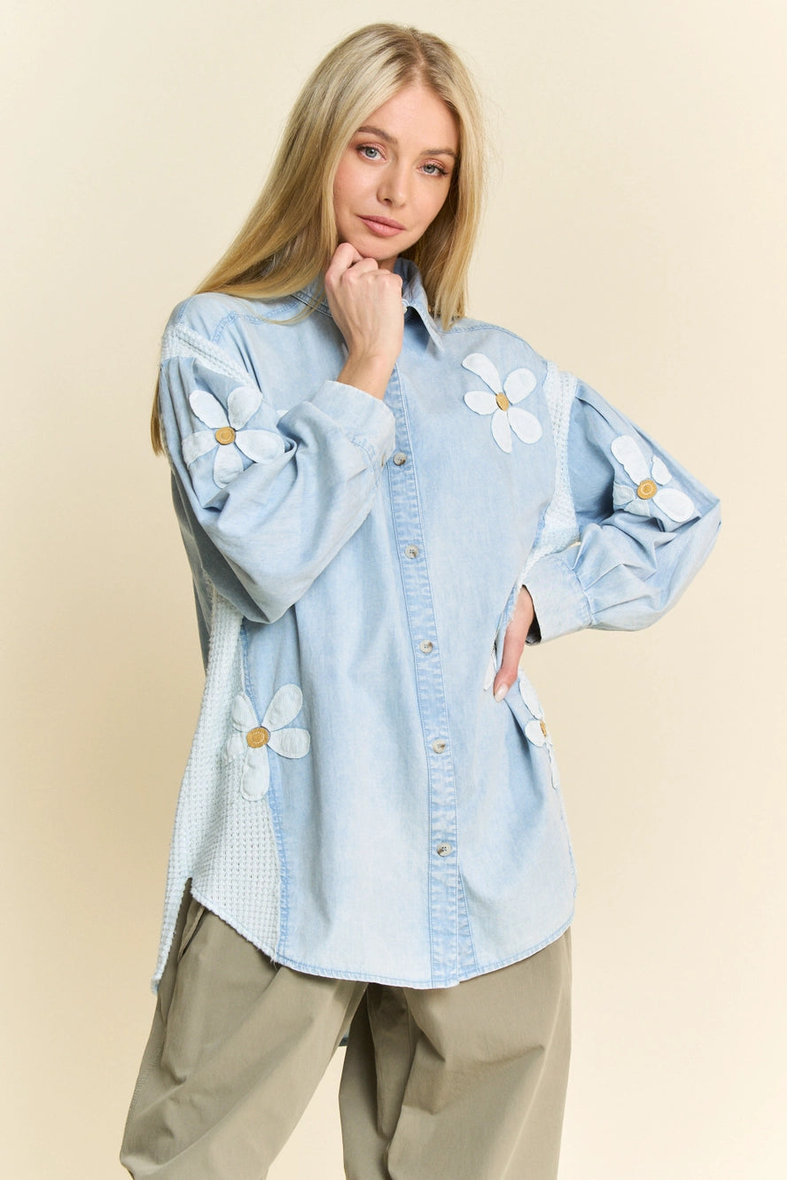Meet your new go-to lightweight denim button-up that adds charm, comfort, and style to any season. This top features whimsical embroidered daisies with waffle knit side panels for a unique blend of texture and personality. The relaxed fit makes it the perfect transition piece — lightweight enough for layering in warmer months but cozy enough for those cooler nights.