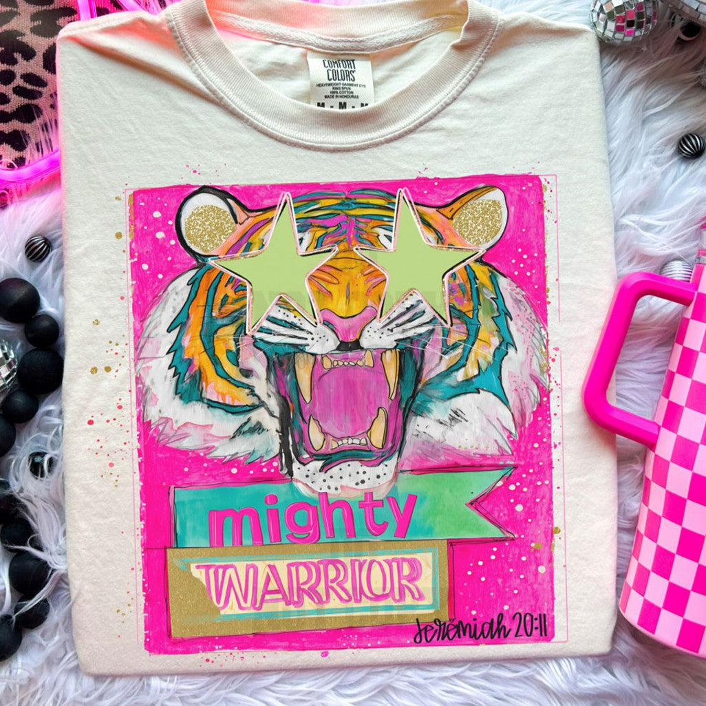 Bold, bright, and full of fearless energy—this graphic tee makes a statement! Featuring a roaring tiger with glitter star eyes and vibrant pops of pink, teal, and gold, it’s all about power and personality. The “Mighty Warrior” message (Jeremiah 20:11) adds a meaningful touch of strength and faith.