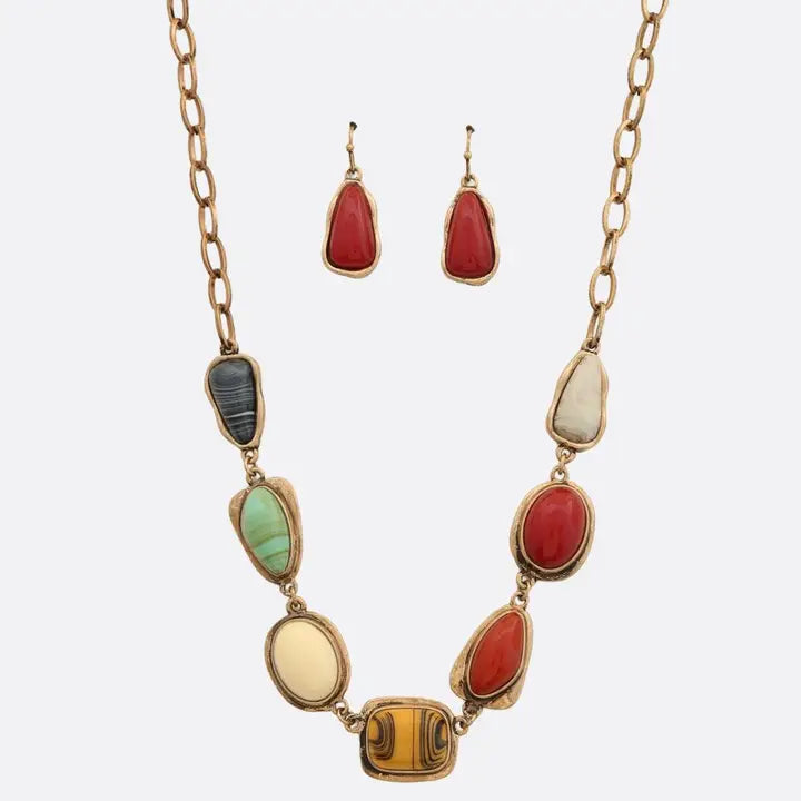 Add bold style to your wardrobe with our Multi-Stone Statement Necklace & Earrings Set. This eye-catching ensemble features a chunky gold-tone chain adorned with vibrant, asymmetrical stone-inspired accents in shades of red, green, mustard, ivory, and charcoal. The matching drop earrings pull the look together with a coordinated pop of color. Whether you’re dressing up a solid top or adding flair to a flowy dress, this set brings just the right amount of artistic flair.