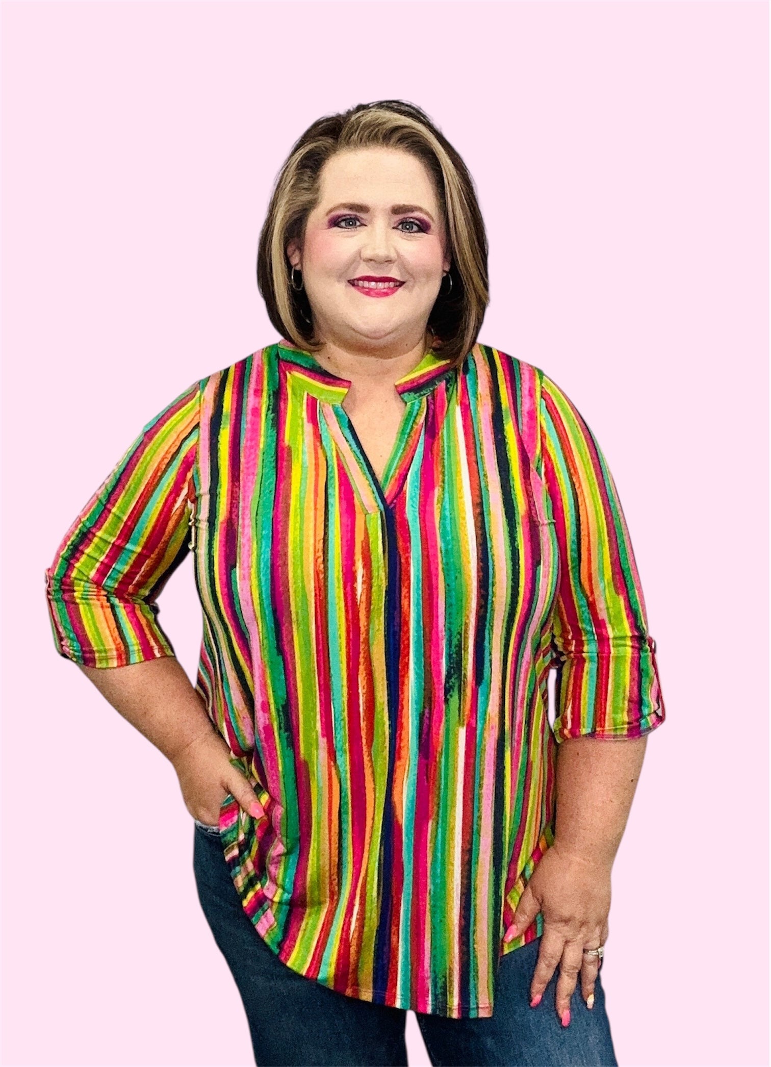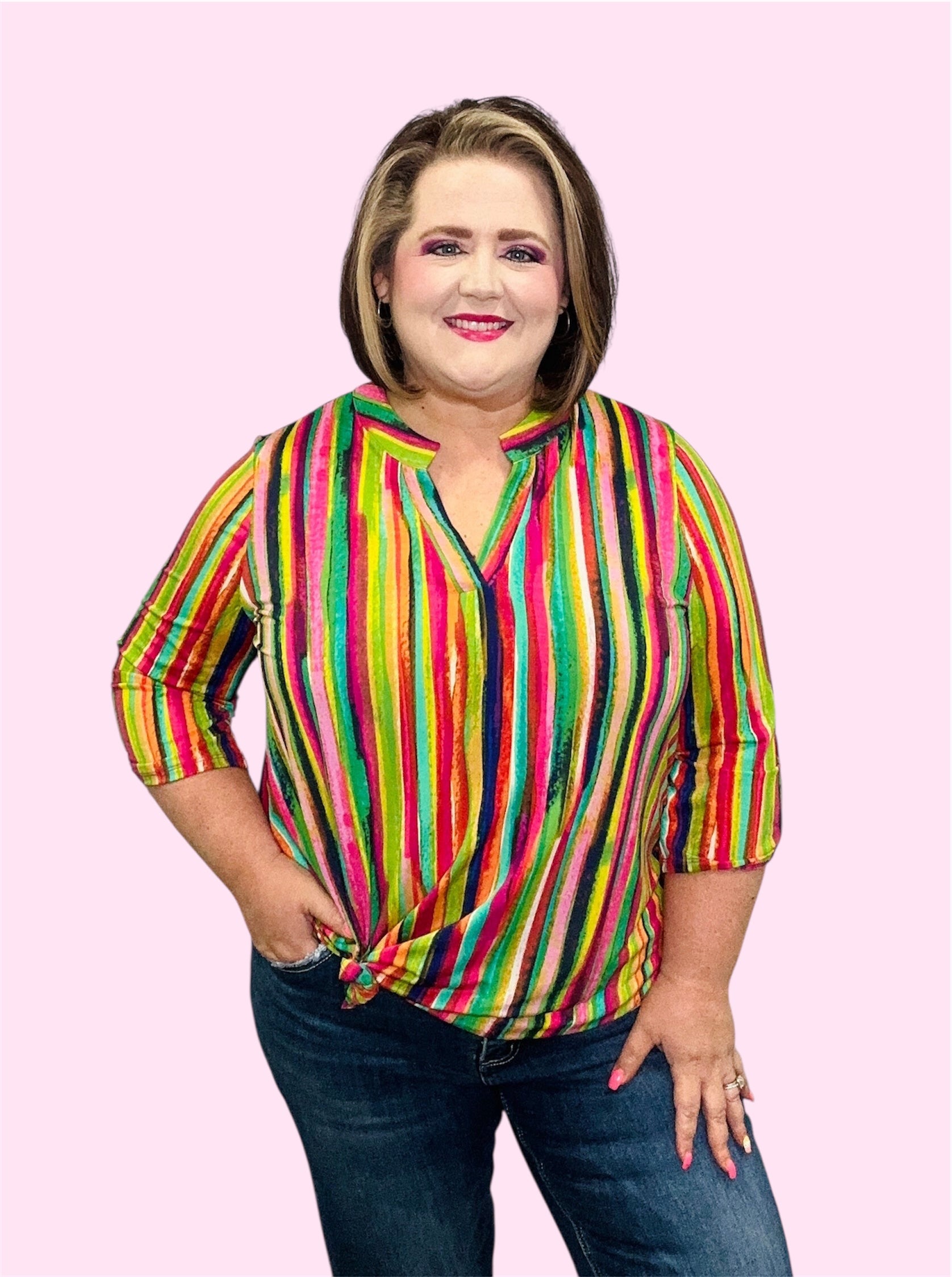 Bright, bold, and effortlessly chic—this multicolor striped V-neck top is the perfect way to add a pop of personality to your look. Featuring vibrant stripes in shades of pink, green, yellow, and blue, this relaxed-fit blouse brings instant energy to your outfit. The roll-tab sleeves offer versatile styling options, while the lightweight, low-maintenance fabric ensures all-day comfort without the hassle. Perfect for pairing with leggings, denim, or shorts for an easy, put-together look.