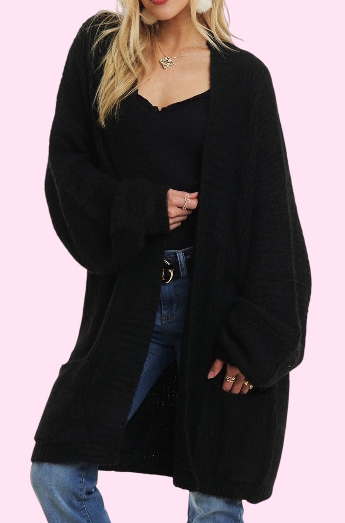 Wrap yourself in cozy comfort with this comfy knit cardigan! Its elegant black color adds sophistication to your wardrobe while the soft, textured knit makes it a layering must-have. Designed with an oversized fit and front pockets, it’s as practical as it is stylish.