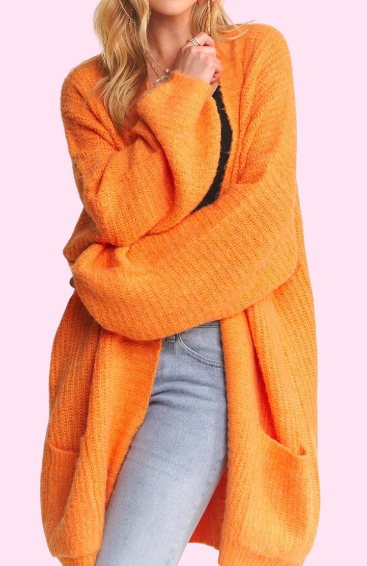 Wrap yourself in cozy comfort with this vibrant knit cardigan! Its bold orange hue adds the perfect pop of color to your wardrobe while the soft, textured knit makes it a layering must-have. Designed with an oversized fit and front pockets, it’s as practical as it is stylish.