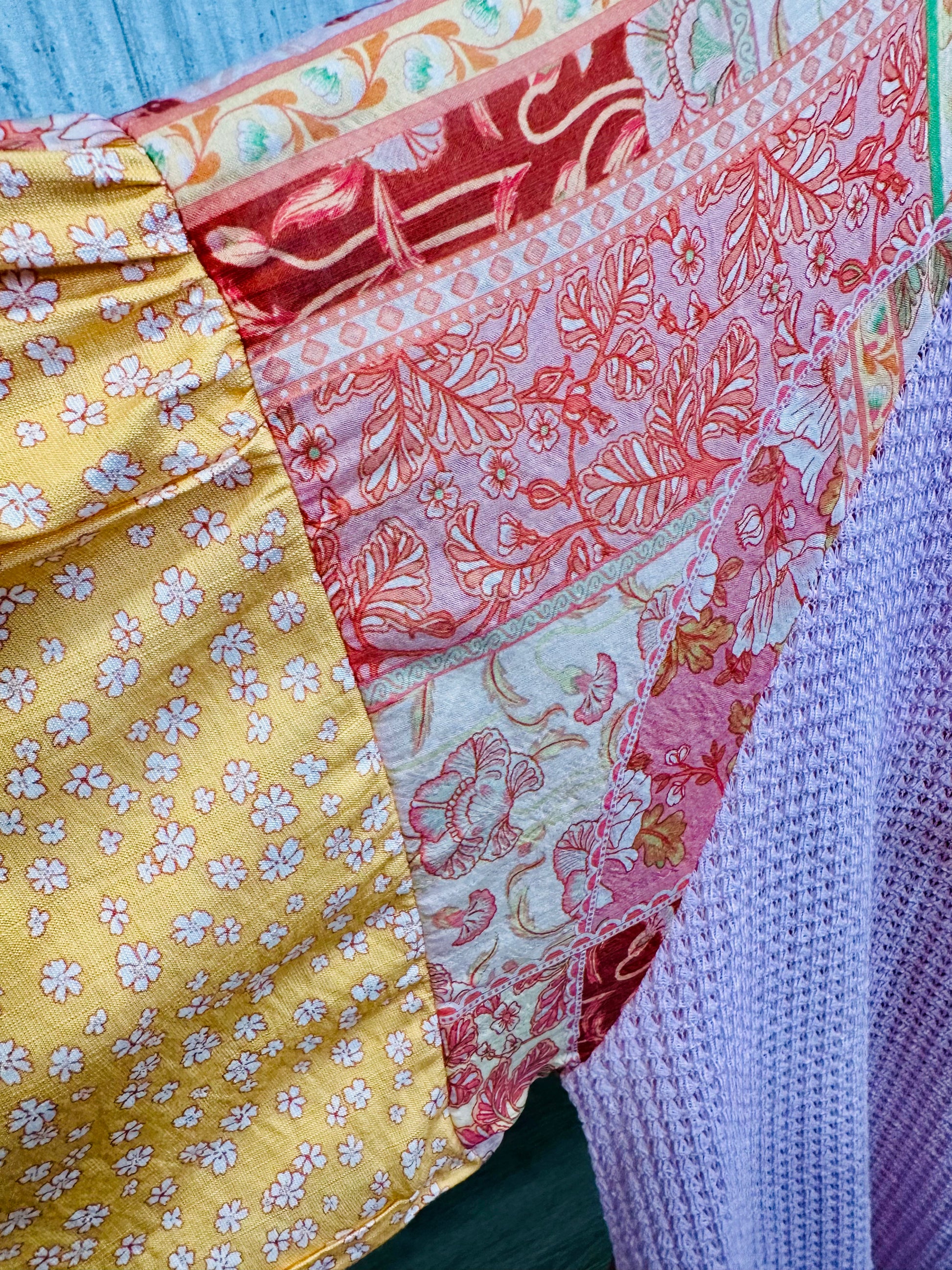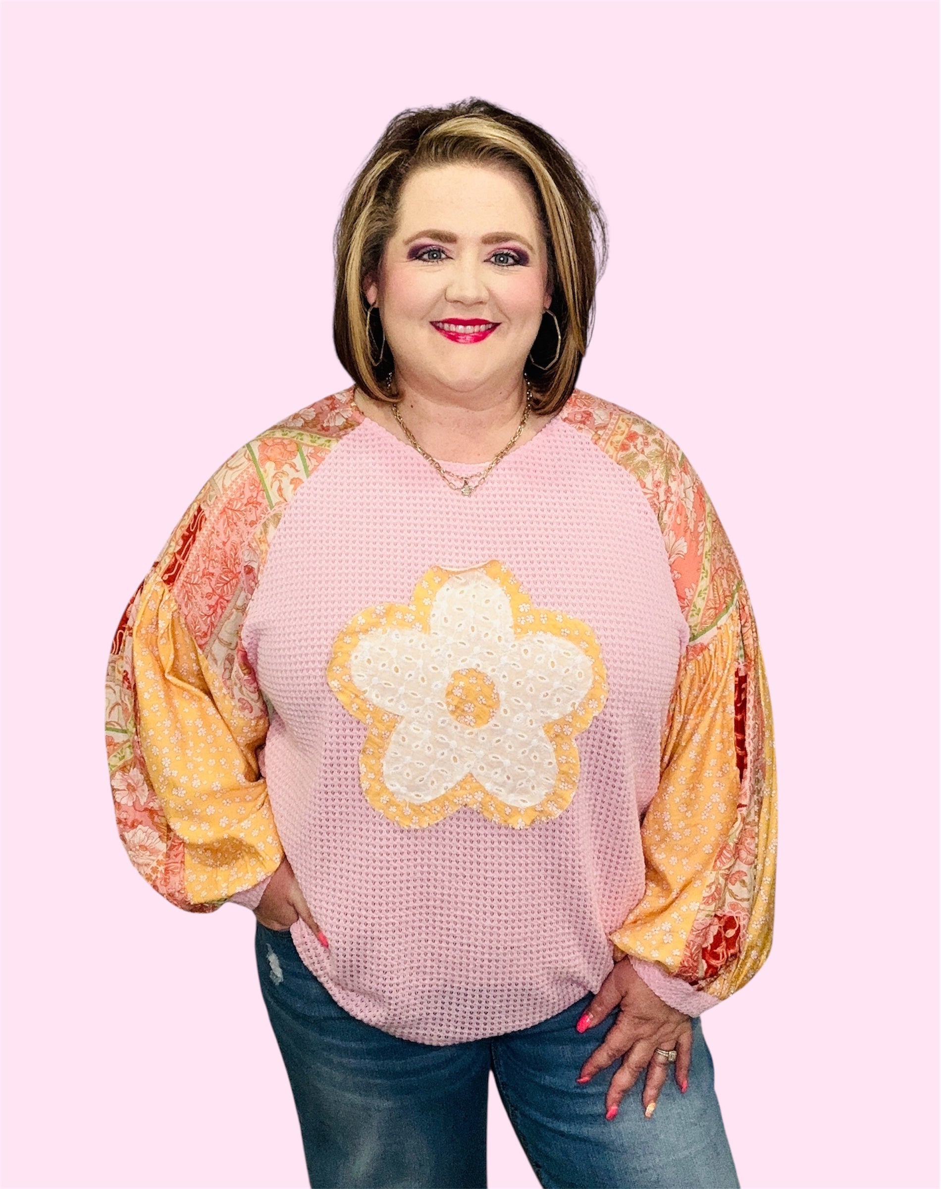 Say hello to cheerful charm in our Patchwork Daisy Waffle Knit Top! This relaxed-fit pullover features a soft pink waffle knit body, vibrant patchwork floral sleeves, and an oversized daisy applique that’s as sweet as springtime. With its mix of textures and prints, this top is full of personality—perfect for brightening up your day.