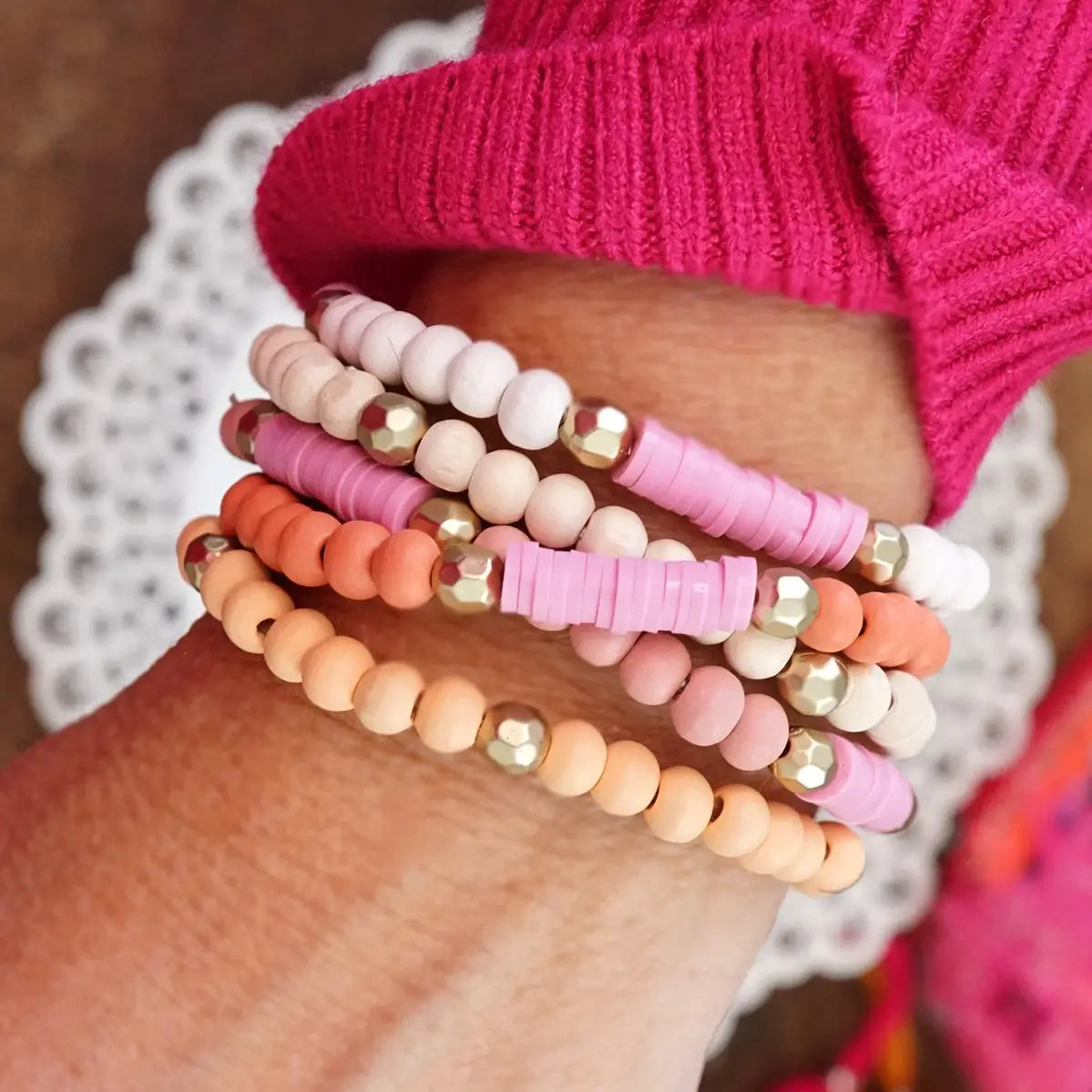 Pink stack of 5 clay and wood beads bracelets in pinks, white and peach