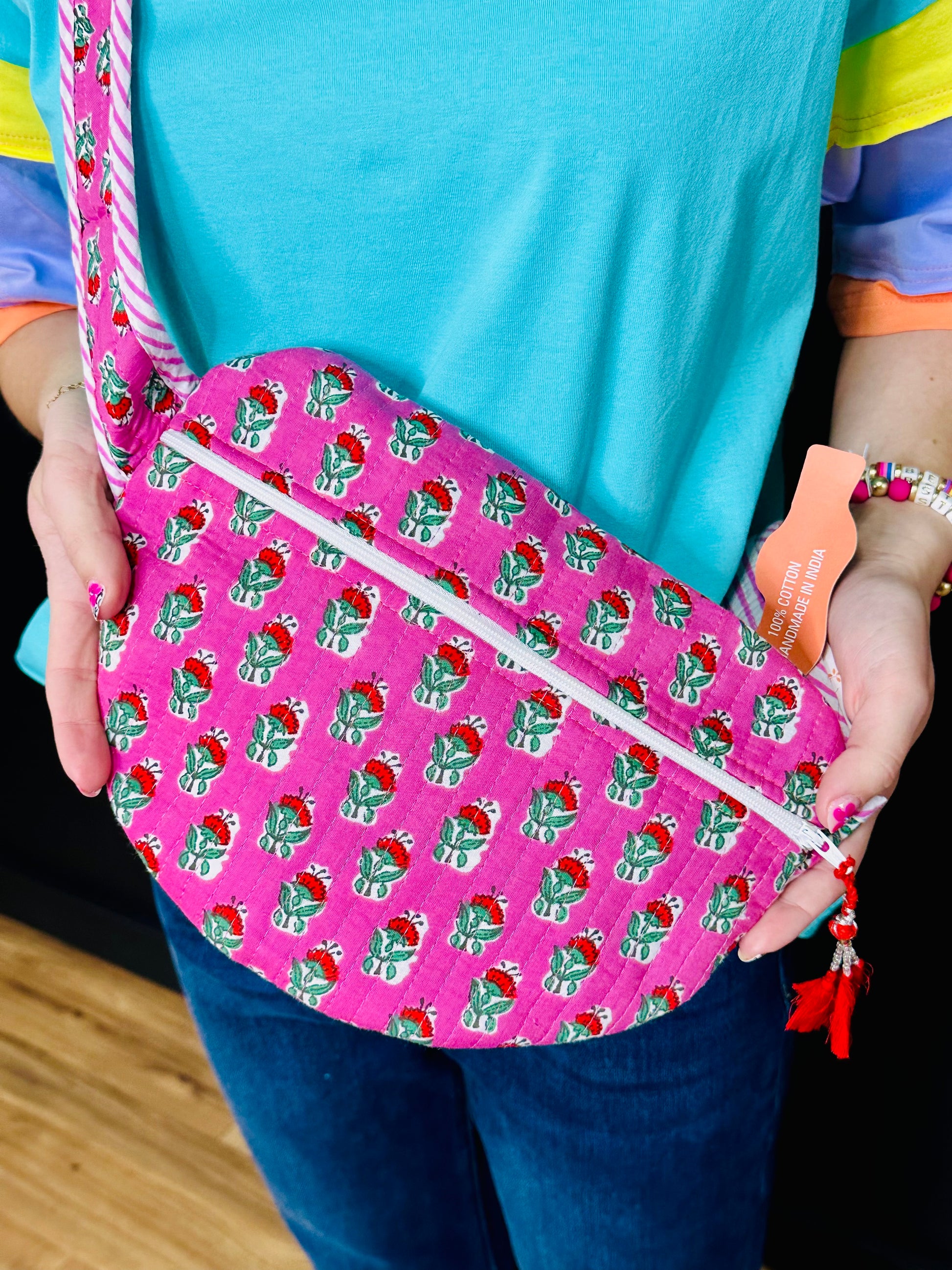 Handmade quilted block print fabric. Perfect for travel. Adjustable belt adjusts to approximately 30"-50" Can be worn on waist or crossbody style