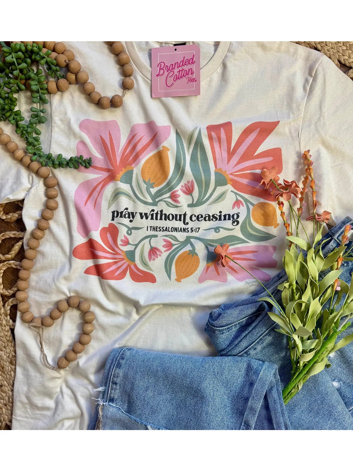 Carry a daily reminder of faith with you wherever you go! The Pray Without Ceasing Tee features a beautifully hand-drawn floral design paired with the inspiring scripture from 1 Thessalonians 5:17. Soft, breathable, and perfect for year-round wear.