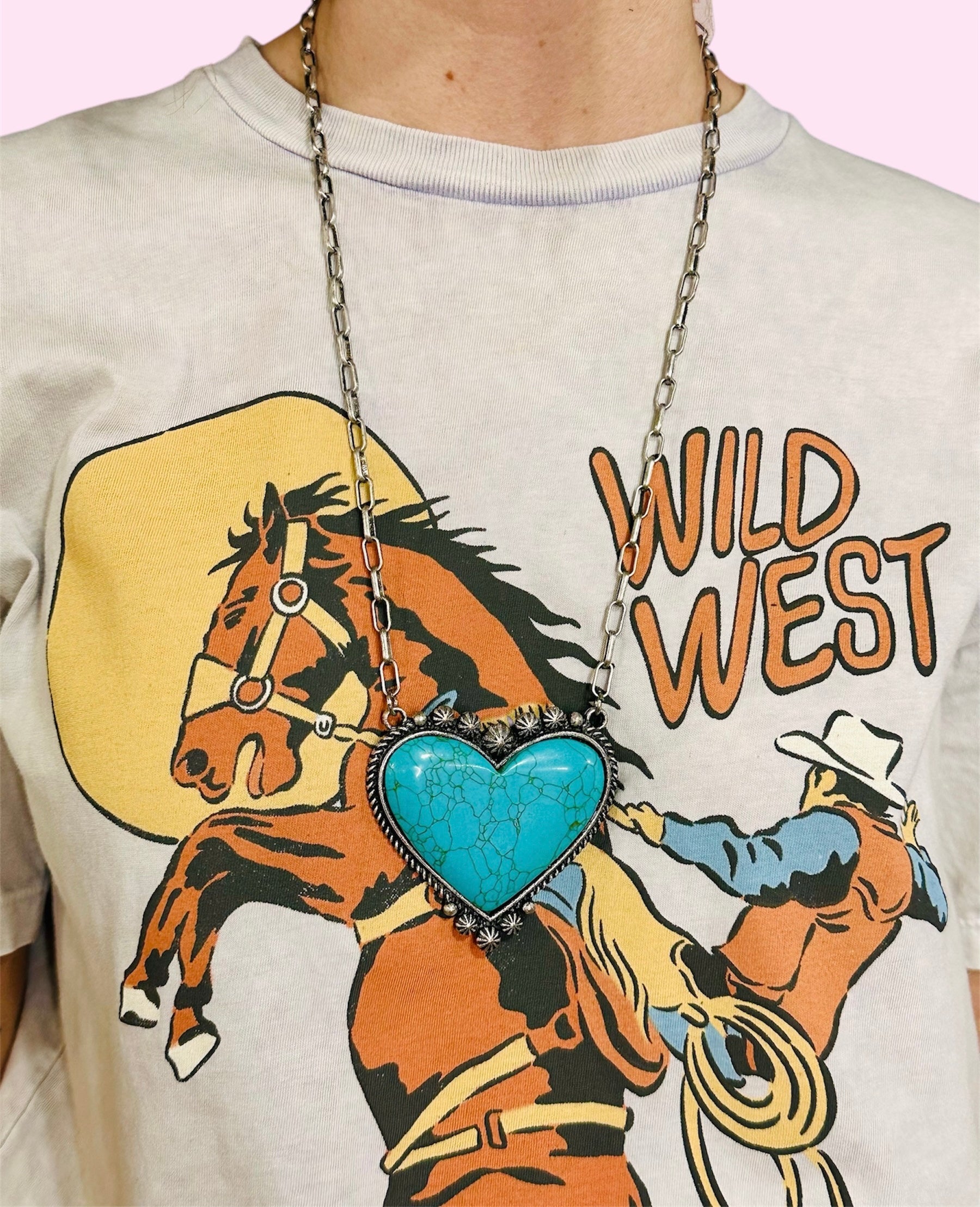 Unleash your inner cowgirl with our Turq Stone Heart Necklace! Embrace the western vibe with the subtle silver paperclip chain, measuring 26 inches for the perfect length. A unique and stylish addition to any outfit, this necklace will bring a touch of rugged charm to your wardrobe.