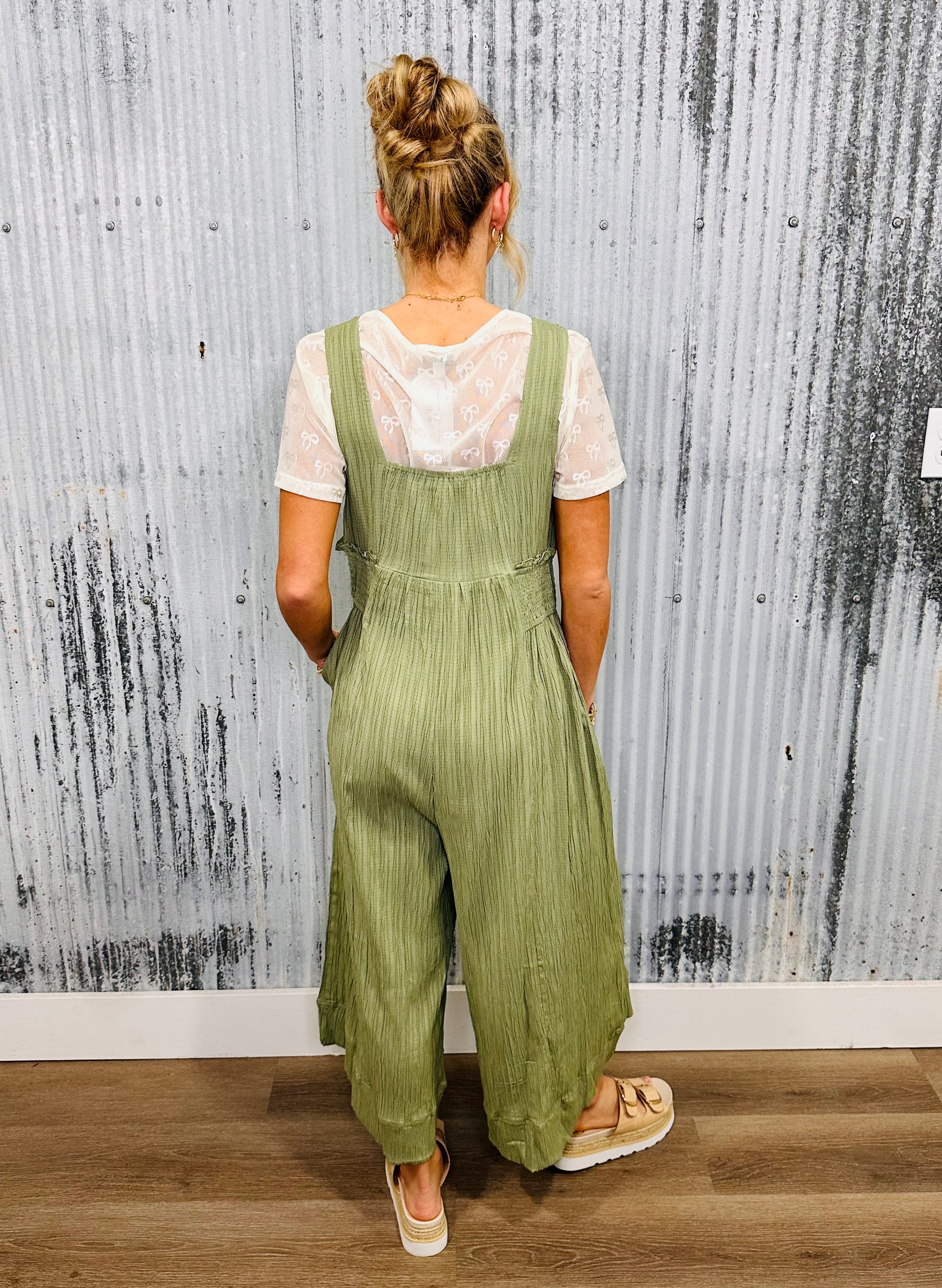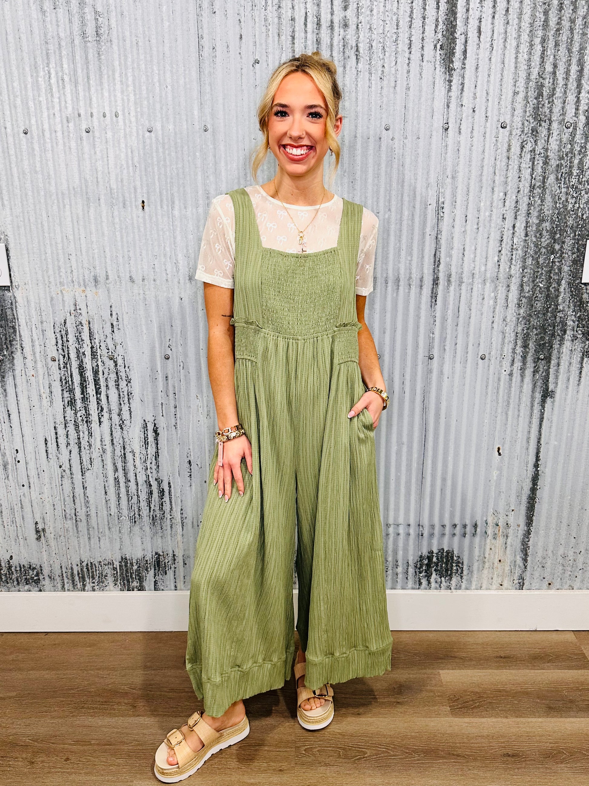 One and done—your new go-to for effortless charm is here. The Easy Does It Smocked Jumpsuit in a soft sage green features a stretchy smocked bodice, adjustable side ties, and flowy wide legs with a cuffed hem for an elevated touch. The subtle texture and dreamy drape give it that “I just threw this on and looked amazing” feel.