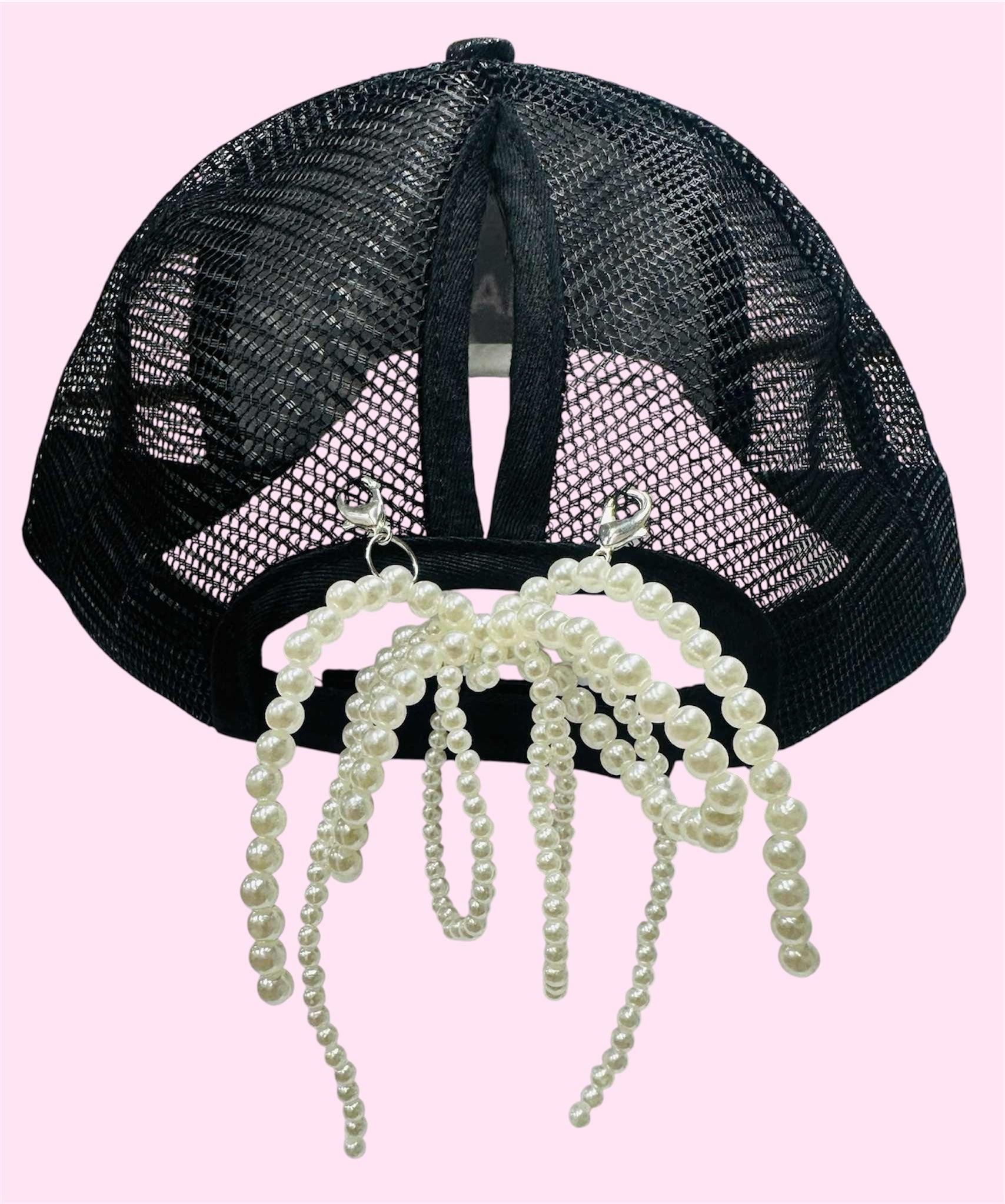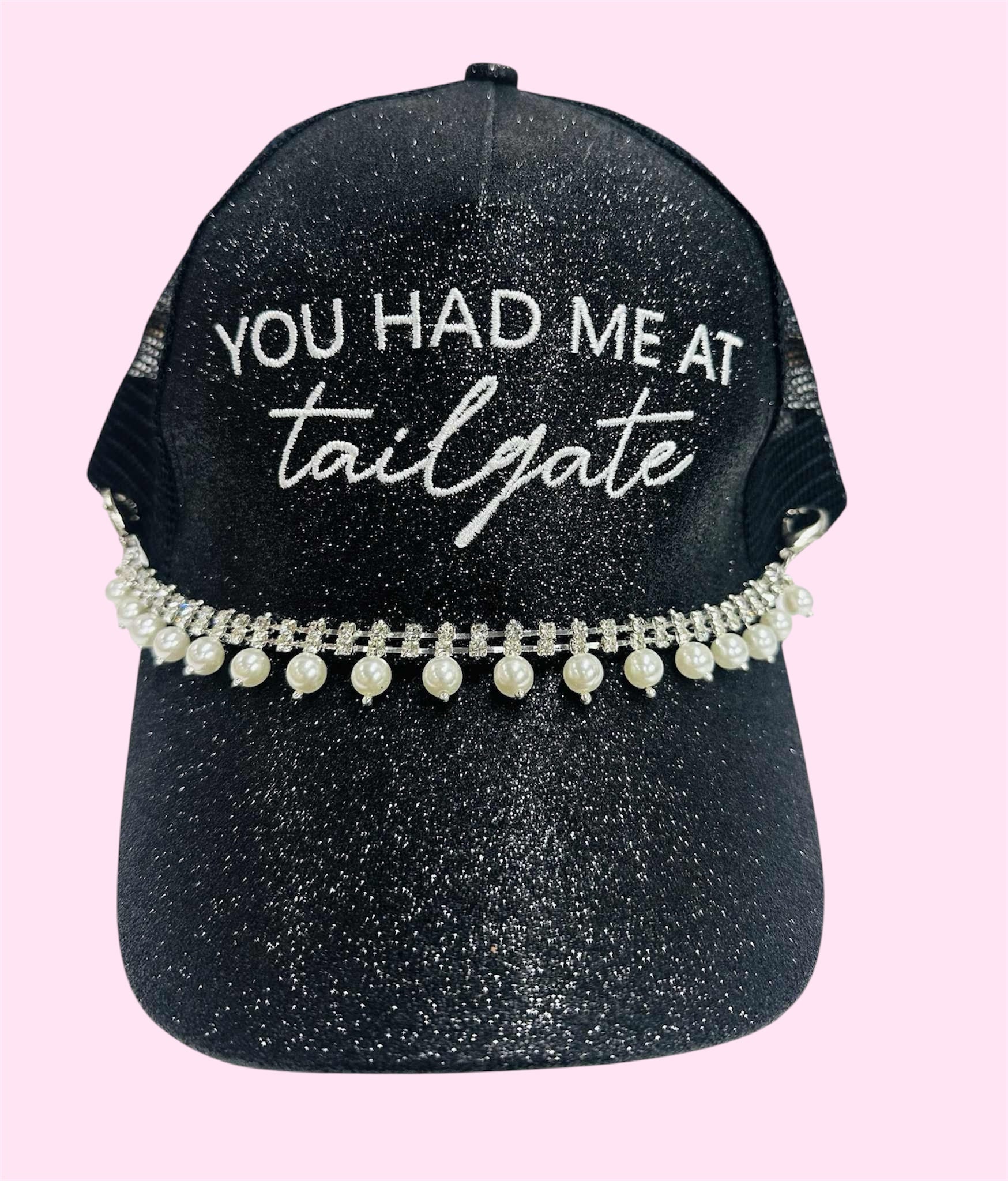 Bring the sparkle to game day with this glam trucker hat! Featuring a glittery black finish, bold white embroidery that reads “You Had Me at Tailgate”, and pearl + rhinestone trim across the bill, this hat is all about team spirit with a touch of style. The mesh back keeps it breathable, while the adjustable snap closure ensures the perfect fit. The back is finished with playful pearl strands for an extra dose of charm.